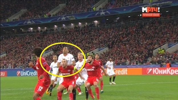 На 30-й минуте матча группового турнира Лиги чемпионов "Спартак" – "Севилья" первый дополнительный ассистент Лука Банти не зафиксировал фол защитника Габриэля Меркадо на полузащитнике Денисе Глушакове, после чего гости сравняли счет. Итальянский рефери, помогающий Джанлуке Рокки, должен был видеть, что игрок испанской команды руками оперся на спартаковца и не позволил тому побороться за верховую передачу. В итоге Симон Кьер, который придерживал руками Георгия Джикию, отправил мяч в ворота. (Александр БОБРОВ)