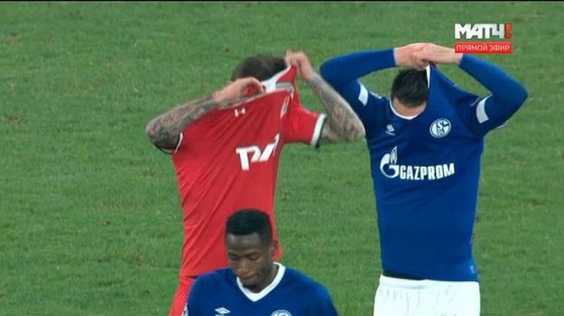 Нападающий "Локомотива" Федор Смолов после матча 6-го тура группового этапа Лиги чемпионов против "Шальке" (0:1) поменялся игровыми футболками с украинским полузащитником "горняков" Евгением Коноплянкой.
