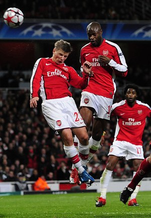 В матче Лиги чемпионов с бельгийской командой в составе "Арсенала" повреждения получили защитник Уильям Галлас и нападающий Андрей Аршавин, неудачно столкнувшиеся друг с другом. Разбивший голову Аршавин смог продолжить встречу, а вот Галлас был заменен в перерыве. Фото - REUTERS и AFP