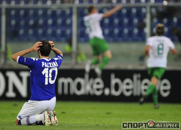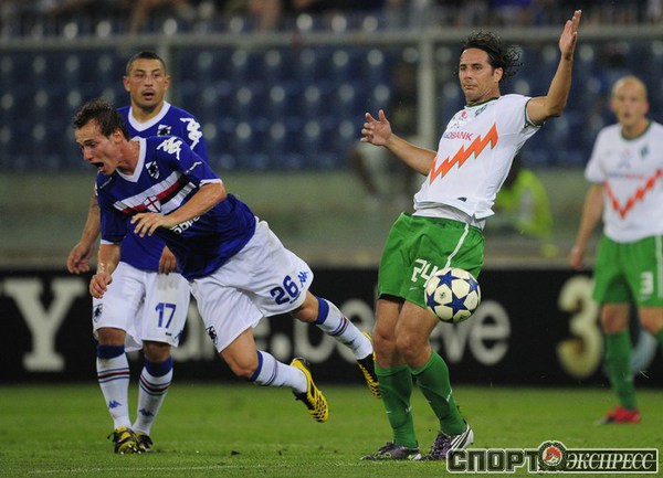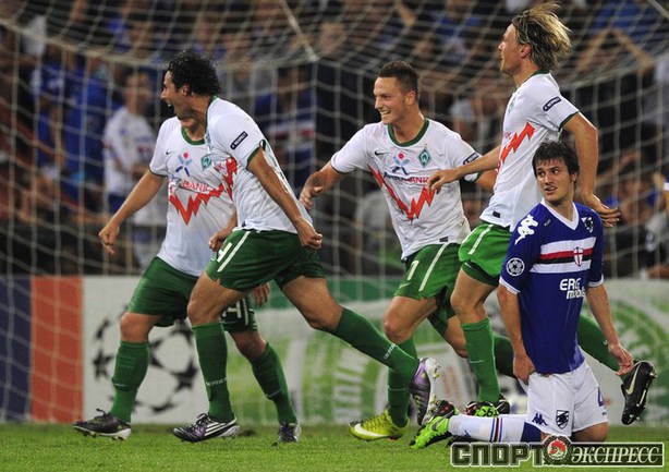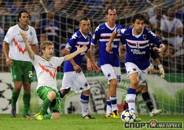 Лига чемпионов. 4-й квалификационный раунд. Турнир 15. Ответный матч. "Сампдория" (Италия) - "Вердер" (Германия) - 3:2 д.в. (2:0, 1:1, 0:1). Голы: Паццини, 8 (1:0). Паццини, 13 (2:0). Кассано, 85 (3:0). Розенберг, 90+3 (3:1). Писарро, 100 (3:2). Первый матч - 1:3. "Андерлехт" (Бельгия) - "Партизан" (Сербия) - 2:2 (0:1). Пенальти - 2:3. Голы: Клео, 15 (0:1). Клео, 53 (0:2). Лукаку, 64 (1:2). Жилле, 71 (2:2). Первый матч - 2:2. Фото AFP