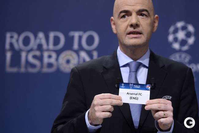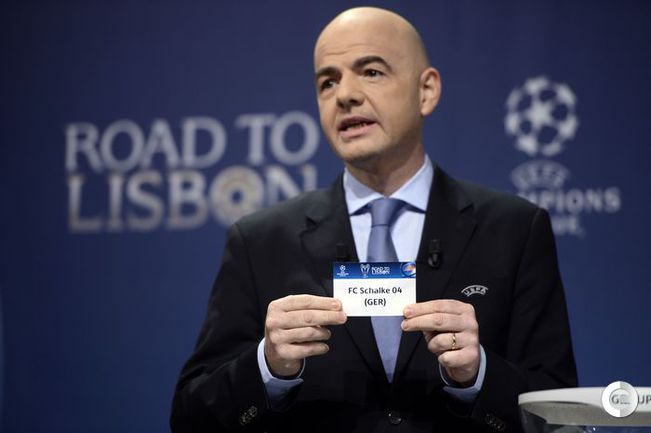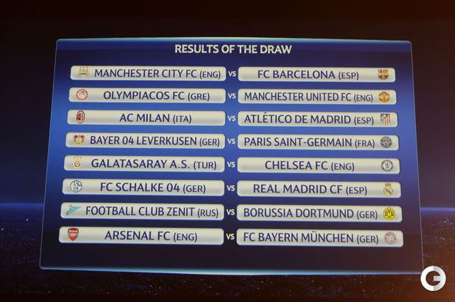 В Ньоне прошла жеребьевка 1/8 финала Лиги чемпионов. "Бавария" – "Арсеналу". "Манчестер Сити" (Англия) – "Барселона" (Испания). "Олимпиакос" П (Греция) – "Манчестер Юнайтед" (Англия). "Милан" (Италия) – "Атлетико" (Испания). "Байер" (Германия) – "ПСЖ" (Франция). "Галатасарай" (Турция) – "Челси" (Англия). "Шальке" (Германия) – "Реал" (Испания). "ЗЕНИТ" (Россия) – "Боруссия" Д (Германия). "Арсенал" (Англия) – "Бавария" (Германия). Фото AFP