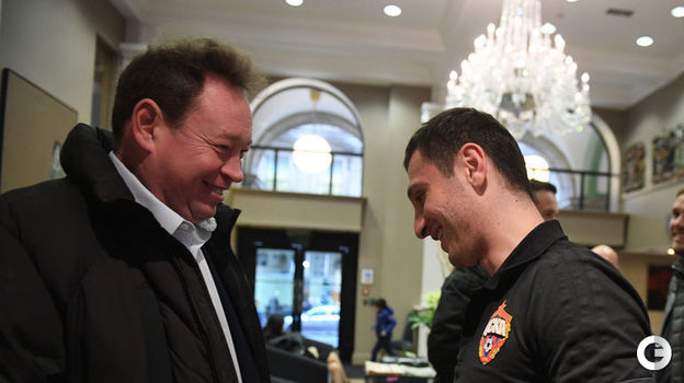 Вечером перед игрой Лиги чемпионов "МЮ" - ЦСКА бывший главный тренер армейцев Леонид Слуцкий, в воскресенье покинувший свой пост в "Халл Сити", заглянул в гости в отель армейцев в Манчестере.