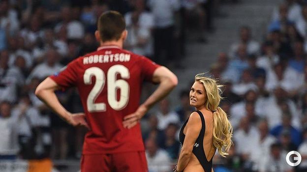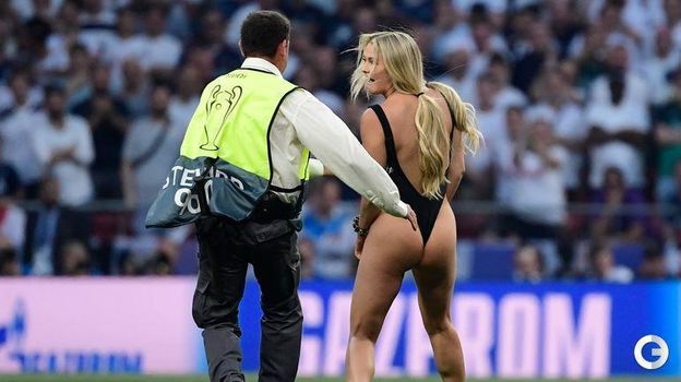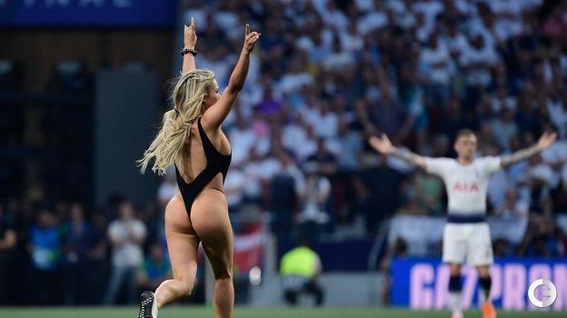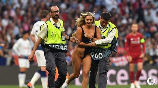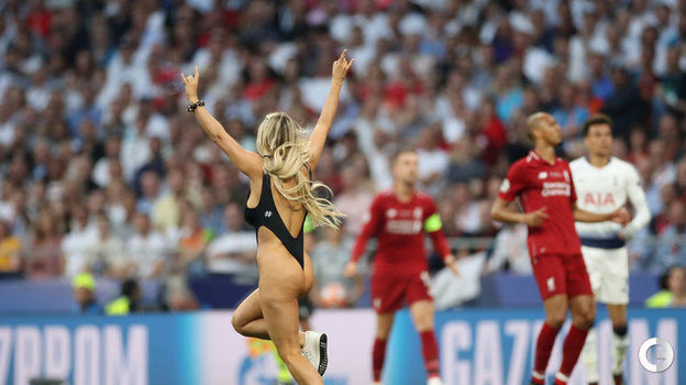 Финал Лиги чемпионов между "Тоттенхэмом" и "Ливерпулем" был прерван в первом тайме из-за того, что на поле выбежала женщина в черном купальнике. Стюарды быстро отреагировали на ситуацию, но остановили бегунью только в центре поля, после чего отвели ее в подтрибунное помещение.
