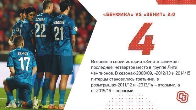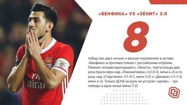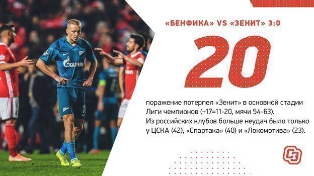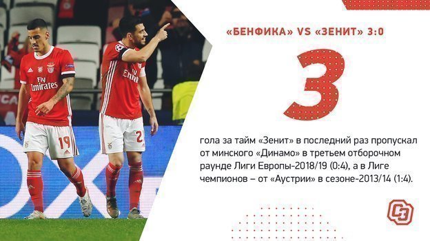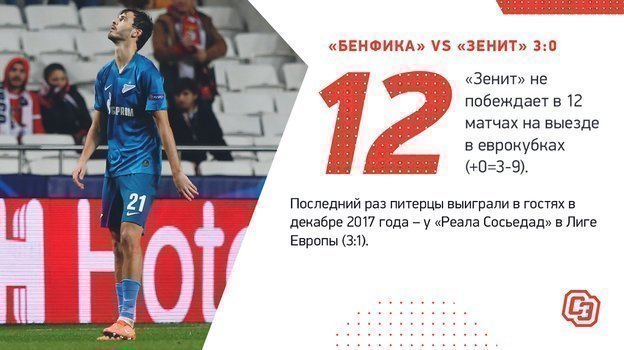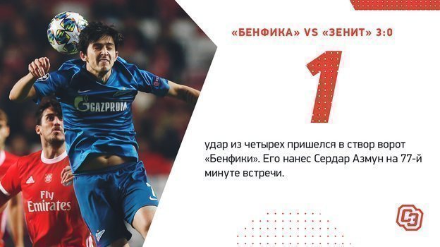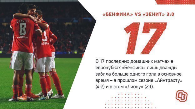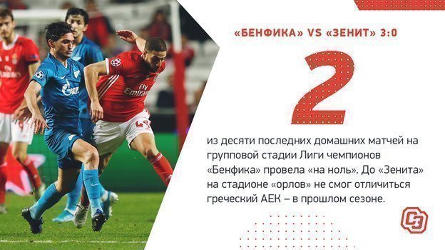 Главные цифры по итогам матча «Бенфика» — «Зенит» (3:0) в рамках Лиги чемпионов.