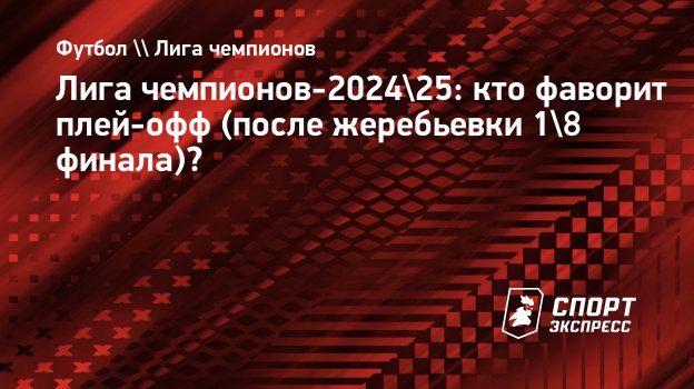 В Лиге чемпионов-2024/25 прошла жеребьевка плей-офф. Пары 1/8 финала: «Брюгге» — «Астон Вилла», «Боруссия» — «Лилль», «Реал» — «Атлетико», «Бавария» — «Байер», ПСВ — «Арсенал», «Фейеноорд» — «Интер», «ПСЖ» — «Ливерпуль», «Бенфика» — «Барселона».