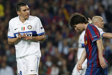 Ответ у "Интера" нашелся. Не в комбинационной игре – мяч у гостей не держался категорически, да и не похоже было, чтобы они по этому поводу переживали. Удалось другое: сбить порыв барселонских звезд, разложить начало встречи на эпизоды жестких столкновений. Камбьяссо, продолжив дело недельной давности, принялся всячески мешать порхать по полю Месси; Мотта грубо остановил совершавшего набег к штрафной Даниэла Алвеса; после подачи "стандарта" потребовалась замена порванной футболке Ибрагимовича. Вскоре Месси от души приложил Майкона, не только внеся новый вклад в нерушимую дружбу аргентинской и бразильской футбольных школ, но и наглядно показав, что в долгу хозяева оставаться не намерены. А вот с атаками дело у "Барсы" обстояло хуже. Да, выбрался на опасную позицию у линии штрафной Хави, опасно скидывал мяч головой Ибрагимович, хлестко пробил с лета после передачи Даниэла Алвеса Педро. Но Хави вместо удара придумал какой-то слишком хитрый пас, скидка Ибрагимовича на все того же Хави не получила логического продолжения, а от ноги Педро мяч пролетел мимо.