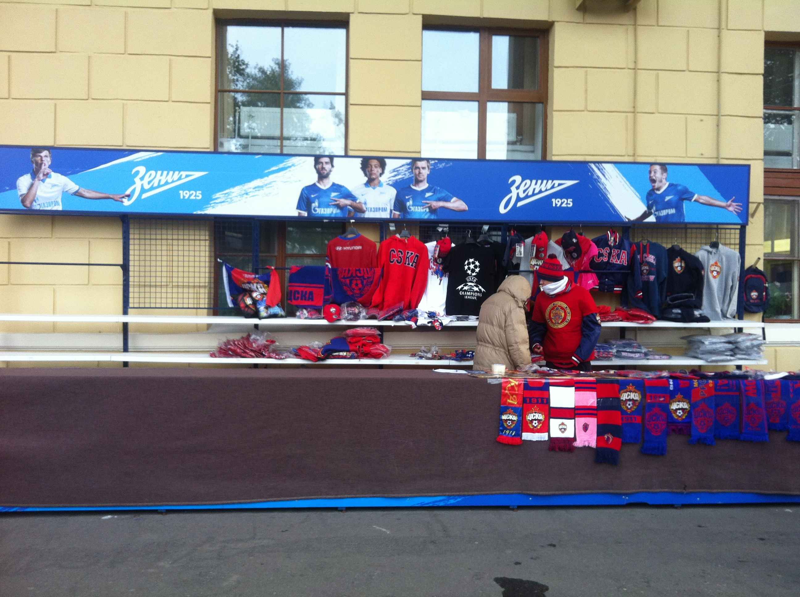 Прямо под сине-бело-голубыми флагами и официальным магазином "Зенита" монтируют палатки с атрибутикой ЦСКА. Забавное, алогичное сочетание. Виктор Файзулин на неубранной рекламке особенно рад, что новая форма "Зенита" теперь красно-синих цветов.