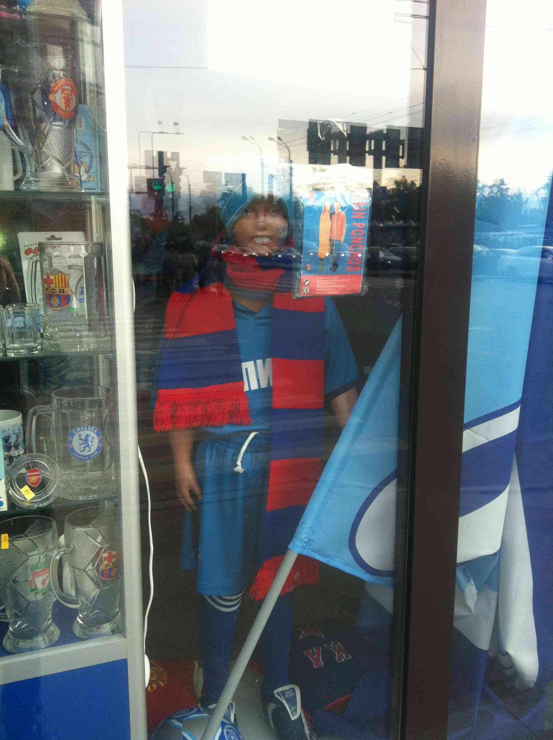 На вечерок перешел в чужую веру и популярный магазин атрибутики "Запасной игрок" в начале Малого проспекта. Легендарный ребенок-манекен на витрине нацепил красно-синий шарф.