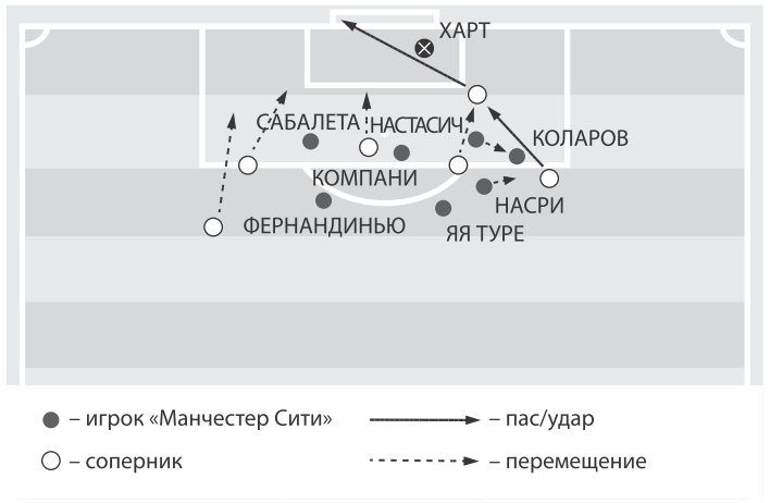 Последовал резкий пас вперед, Туре пропустил мяч Сильве, получил обратно, заложил финт. В это время сбоку от линии обороны помчался в штрафную Негредо, на дальнюю штангу устремился Агуэро, а Сильва традиционно побежал на 11-метровую отметку. В две секунды оборона "Эвертона" была разорвана.