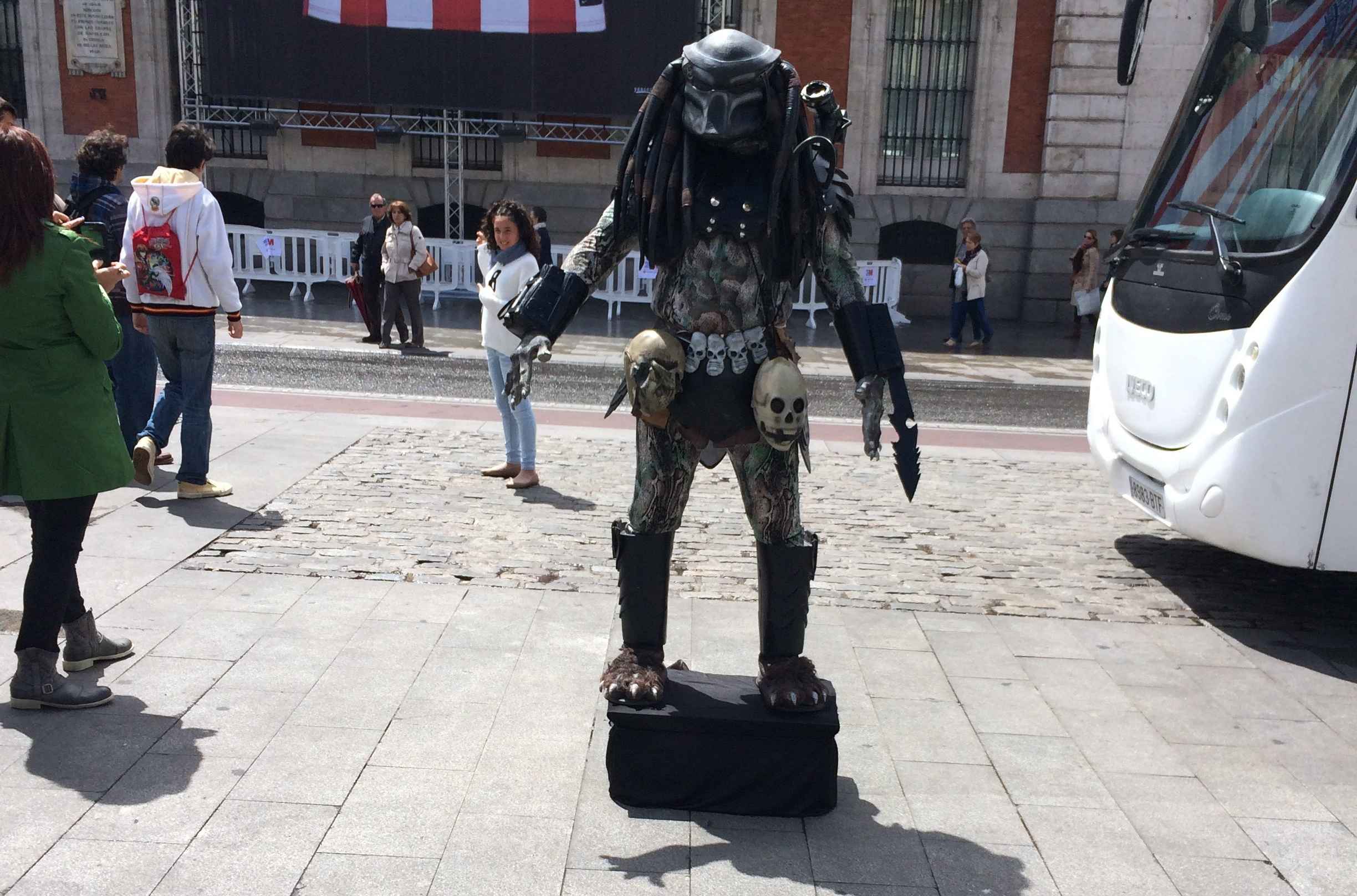 Так в центре города висят огромные плакаты с гербами команд, словно афиши о приезде иностранных поп-звезд. Рядом с этими художествами – туристов и проходимцев развлекает... Хищник. Герой одноименного фильма. В центре Мадрида он готов схватить за горло, пусть и в шутку, любую невинную овечку, проходящую рядом. Как и команды сегодня друг друга. Но тут уже все всерьез. А пока в аэропорту всех радостно встречает болельщик "Реалетико". По крайней мере, его смешанная майка говорит как раз об этом.