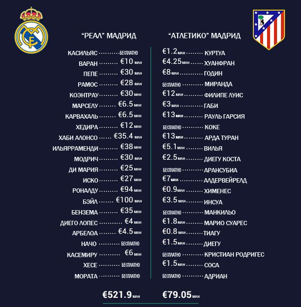 Но одно дело, за сколько кто куплен, а другое – сколько кто стоит сейчас. И здесь "Атлетико" своими результатами подтянулся к вечно смотрящим свысока землякам. Команда Диего Симеоне, разумеется, дешевле, но явно не в шесть раз. Вот сколько стоят игроки команд сегодня, согласно прописанным в их контрактах отступным и по оценке экспертов: