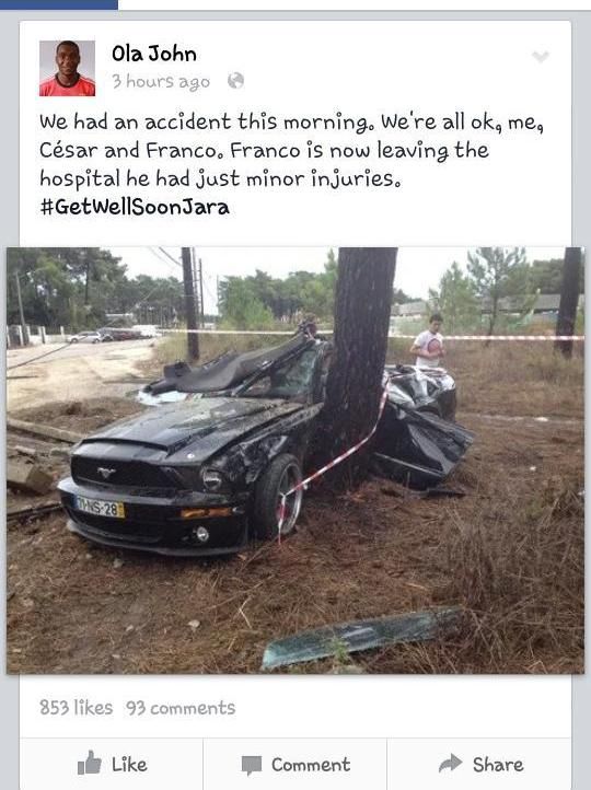 Дело было так: 26-летний футболист ехал с партнерами по командами с превышением скорости на автомобиле "Форд Мустанг" в Шарнека-де-Капарика - пригороде Лиссабона. Водитель потерял контроль над автомобилем, вылетел с трассы, снес электроопору и врезался в дерево. Нападающего доставили в госпиталь. Двое других футболистов "Бенфики" - Ола Джон и Сезар , также находившиеся в автомобиле, не пострадали.