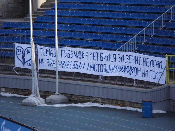 В субботу на матче 7-го тура чемпионата России между "Зенитом" и "Динамо" болельщики сине-бело-голубых на пустом фанатском вираже вывесили баннер в честь словацкого защитника Томаша Губочана, который в конце лета пополнил состав бело-голубых. На полотне было написано: "Томаш Губочан шесть лет бился за "Зенит", не лгал, не предавал, был настоящим мужиком на поле":