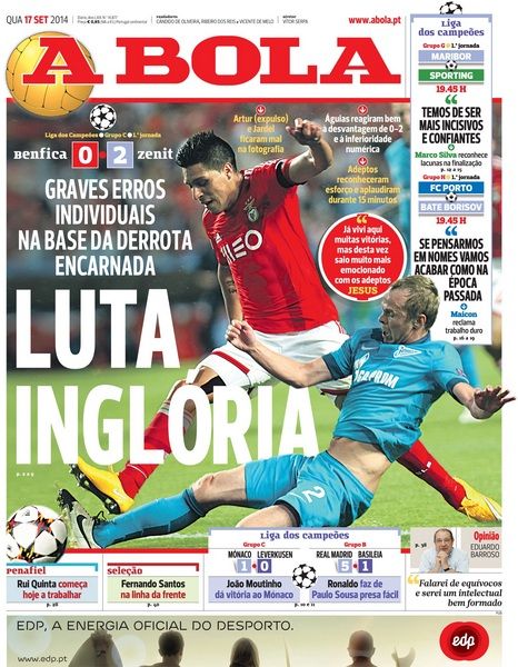 В Португалии - грусть и тоска. Газета A Bola вышла с шапкой "Бесславная битва". Подзаголовок гласит: "Серьезные индивидуальные ошибки привели к поражению".