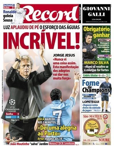 Самая короткая "шапка" сегодня принадлежит газете Record. "Невероятно!" - вот и весь заголовок.