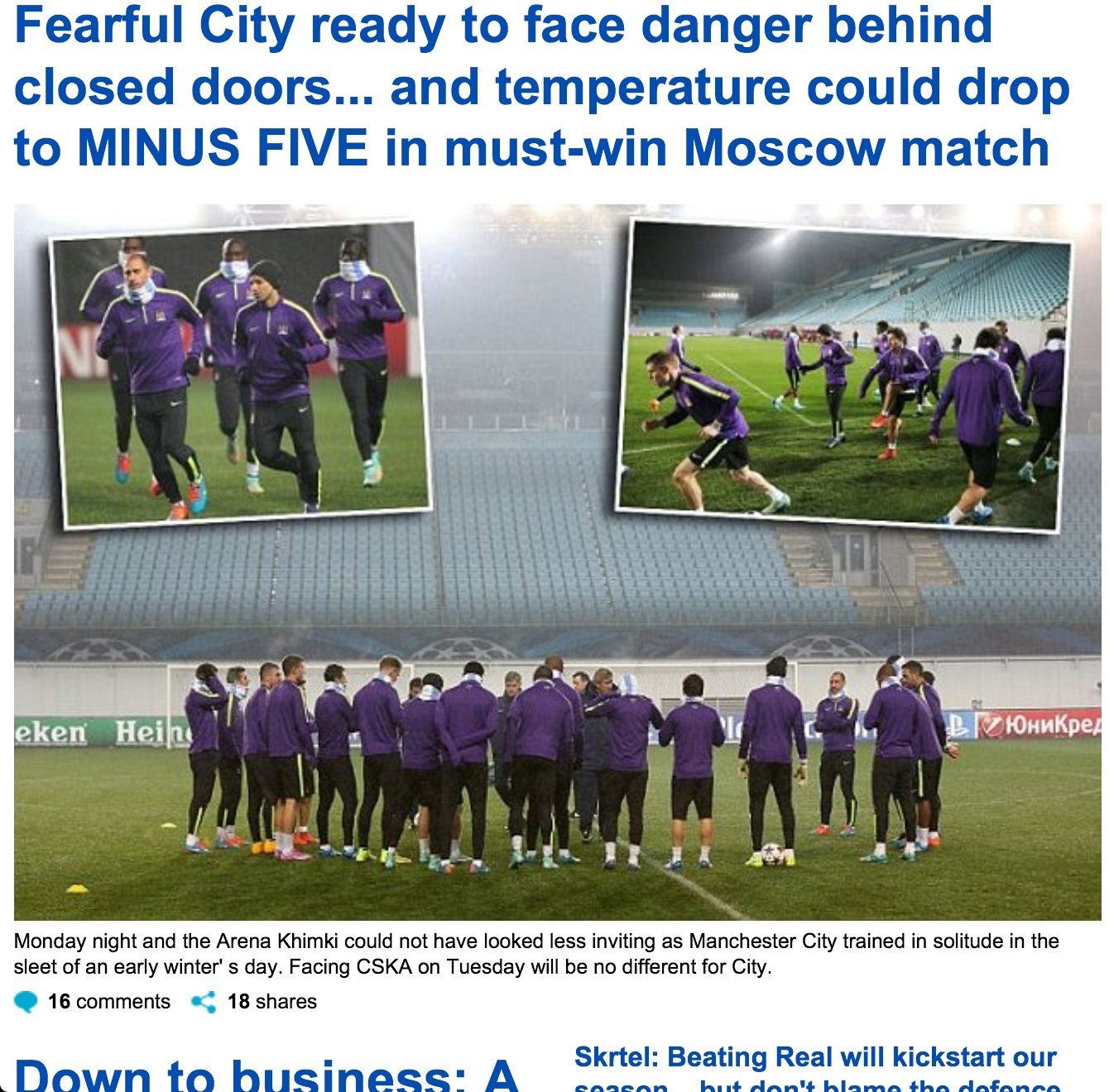 "Температура в Москве может упасть этим вечером до МИНУС ПЯТИ!". С этого предложения британская Daily Mail начинает предматчевый репортаж своего корреспондента Иэна Ледимена. Пустота и мороз – вот главные соперники "Манчестер Сити" по мнению издания.