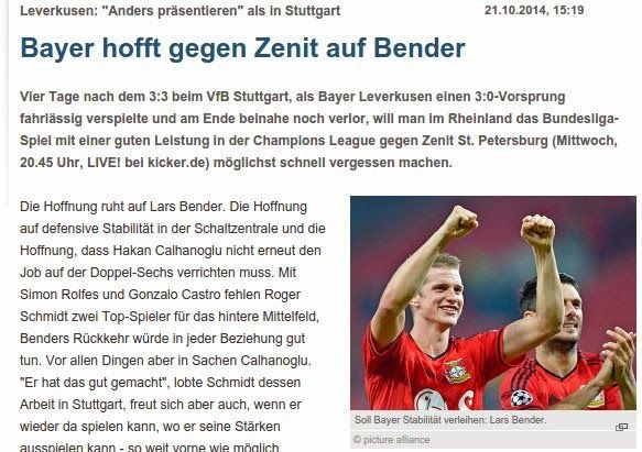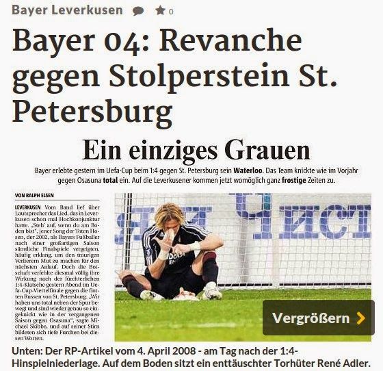Газета Rheinische Post вспоминает противостояние этих команд 2008 года, когда "Зенит" прошел "Байер" в 1/4 финала Кубка УЕФА. Так что предстоящий матч – не только шанс реабилитироваться за упущенную победу при счете 3:0 в прошлом туре бундеслиги, но и возможность поквитаться за позор из прошлого. Теперь нужно постараться не допустить того, что произошло пять с половиной лет назад, – а именно, победить "Зенит", а затем выйти в 1/8 финала Лиги чемпионов. Возможно, чтобы не допустить повторения того кошмара, нужно показать игрокам запись того поражения со счетом 1:4. К слову, в составе "Байера" с тех пор остались всего три игрока: Симон Рольфес, Гонсало Кастро и Штефан Киссллинг. Два первых не сыграют из-за травм, Кисслинг же, забивший единственный гол "Байера" в 2008-м, должен выйти на острие леверкузенских атак.