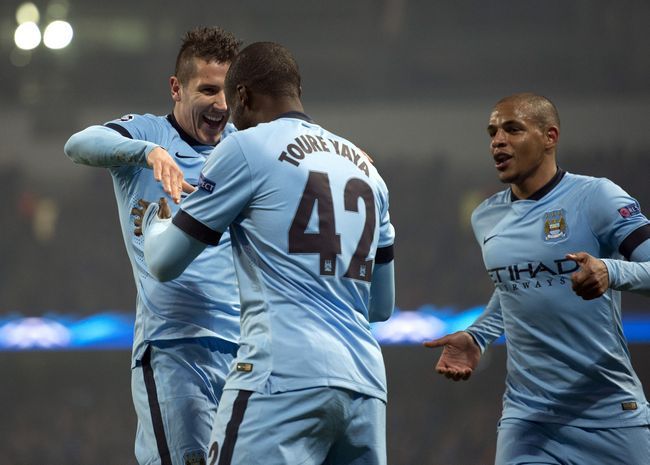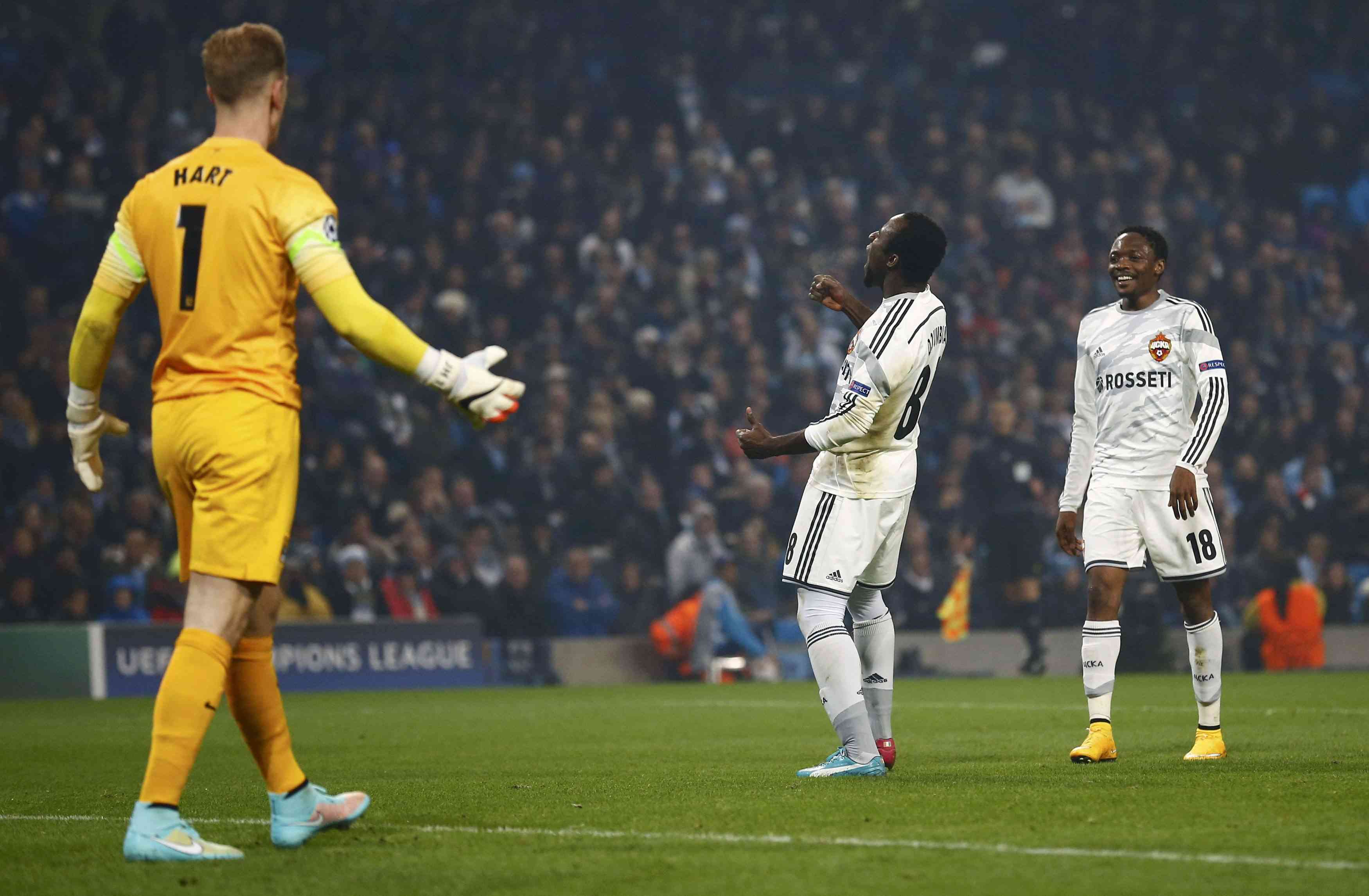 Вчера. Манчестер. "Манчестер Сити" - ЦСКА - 1:2. 8-я минута. Яя ТУРЕ и партнеры празднуют взятие ворот ЦСКА. Фото REUTERS