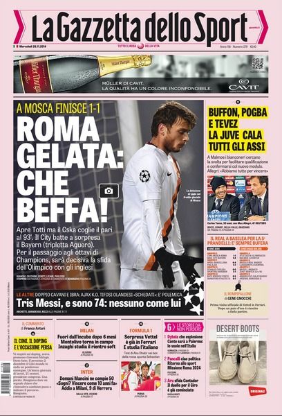 Ведущие итальянские не стеснялись в выражениях относительно гола, пропущенного "Ромой" на 93-й минуте. Так, La Gazzetta dello Sport назвала произошедшее в Химках оскорблением, а саму "Рому" – замороженной. В то время как Corriere dello Sport (внизу) считает оскорблением то, что из России римляне возвращаются с одним, а не с тремя очками.