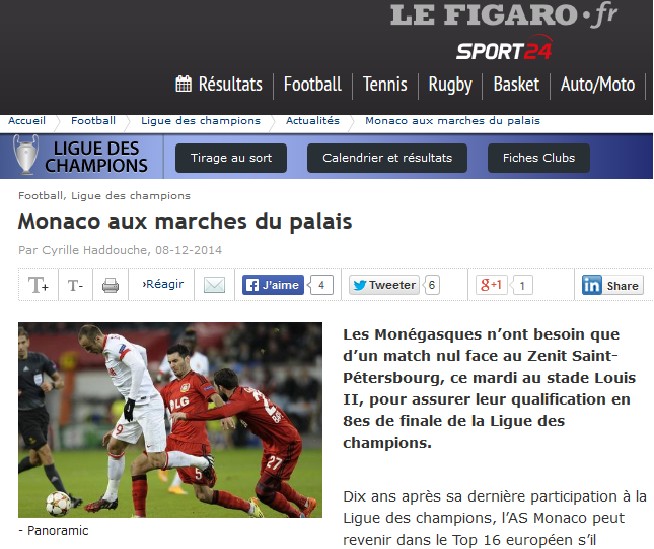 "Инертная атака и стальная защита" – так характеризует игру монегасков Figaro. И находит в этом аналогии с действиями русских менеджеров клуба. С 2 забитыми и 1 пропущенным мячом "Монако" может выйти в плей-офф. А если в сегодняшнем матче будет зафиксирована ничья 0:0, то "Монако" станет первой командой Лиги чемпионов, которой для выхода хватило 2 забитых мячей. Эта минималистская игра на поле отражает политику экономии, к которой вернулся клуб в межсезонье, избавившись от звезд калибра Фалькао и Родригеса, пишет французская газета.