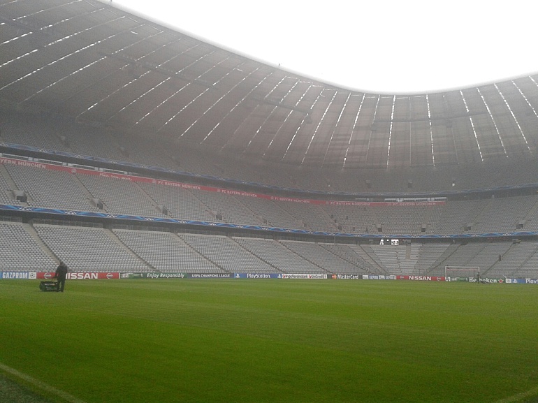 В Мюнхене 0 градусов и очень холодно, но поле – в идеальном состоянии. А работники арены заботливо стригут траву.