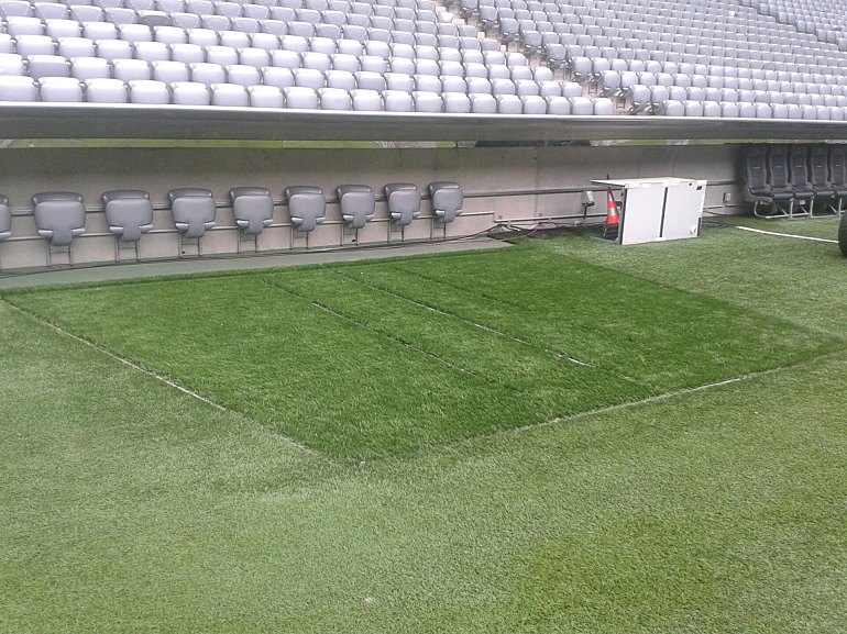 Перед игрой этот зеленый квадрат из искусственной травы поднимается, и из тоннеля футболисты поднимаются на поле.