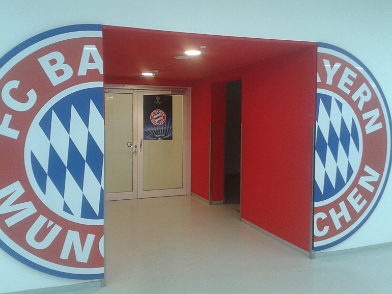 В саму домашнюю раздевалку уже не пускают, но вход и коридор перед ней – к услугам студентов факультета "Менеджмент в игровых видах спорта" бизнес-школы RMA, приехавших на экскурсию и лекции в "Баварию".