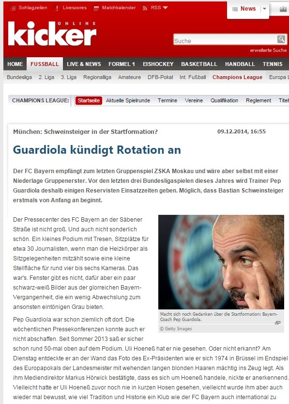 "Гвардьола объявляет ротацию", – гласит заголовок на сайте авторитетнейшего немецкого спортивного издания. В заметке обращается внимание, что матч с ЦСКА пройдет перед "английской неделей" в бундеслиге, в течение которой мюнхенцам предстоит сыграть с "Аугсбургом", "Фрайбургом" и "Майнцем". В связи с этим и, естественно, с тем, что "Бавария" давно обеспечила себе первое место в группе Лиге чемпионов, Гвардьола сообщил, что против москвичей на поле выйдут и резервисты. "Не знаю только, сколько", – говорит тренер. Издание пишет, что надеются сыграть в среду Роде, Шачири, Хейбьерг. Но главное, что впервые в сезоне с первых минут на поле может выйти Швайнштайгер, который, как мы знаем, только недавно залечил травму, полученную на ЧМ-2014. Вот мнение о значении встречи с ЦСКА защитника Боатенга: "Матч с Москвой важен для того, чтобы оставаться в ритме, поддержать наш необходимый привычный уровень. Выигрывать всегда здорово". Гвардьола же еще и предупреждает: "У Москвы есть сердце. Это ее последний шанс. Они будут пытаться сделать все, что можно. Все думали, что после трех игр они уже вылетели, но Москва может бороться".