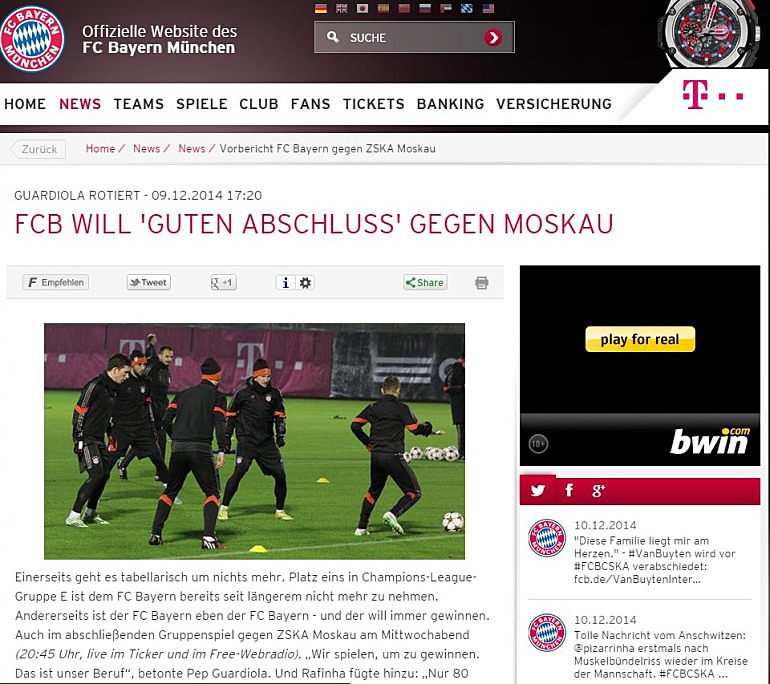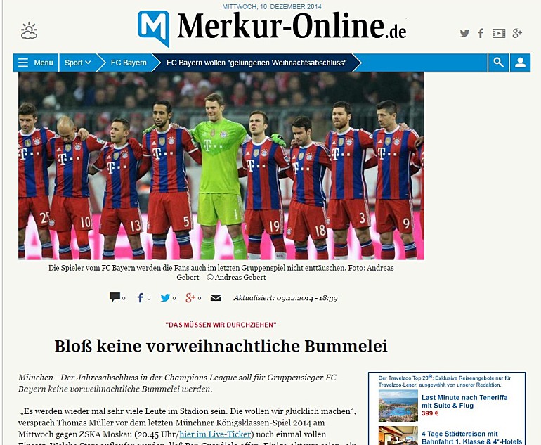 "На стадионе снова будет очень много людей. Мы хотим их сделать счастливыми", – заявляет перед поединком с ЦСКА Мюллер. Приводятся и слова Роббена, который замечает, что после матча с москвичами до зимней паузы останется 10 дней, и команда хочет завершить год успешно. Поэтому голландец подчеркивает: "Мы пока еще о Рождестве не думаем". Издание отмечает, что успех в среду может принести "Баварии" не только миллион евро. Пока наиболее успешно на групповой стадии команда выступили в минувшем сезоне – 15 очков и разница мячей – 17:5. Если баварцы одолеют ЦСКА с преимуществом в 4 гола, то превзойдут это достижение, ведь на данный момент у команды 12 очков и разница – 13:4.