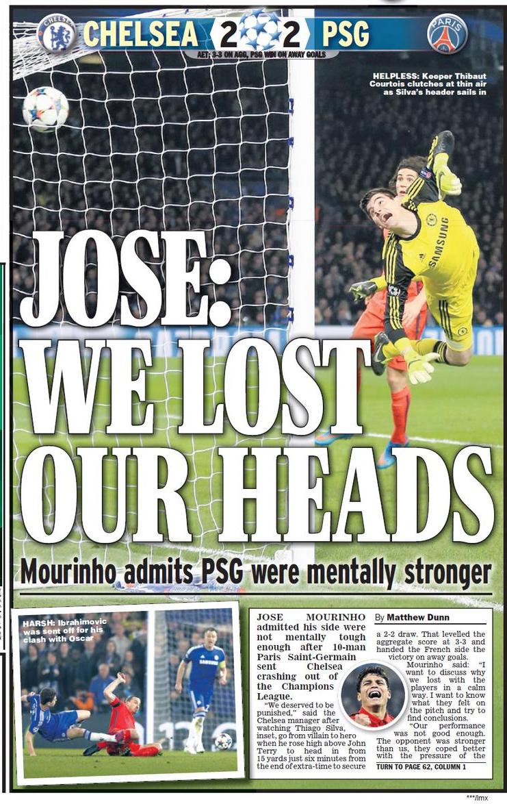 Дважды "Челси" вел в счете, но оба раза десять сплоченных парижских парней смогли нанести ответный удар. Многие бы команды сникли, если бы на их долю выпали такие испытания, но "ПСЖ" проявил себя превосходно. Французская команда лучше играла, лучше сражалась и лучше думала. "Челси" выглядел зажато, словно Моуринью вбил игрокам в голову кучу ненужной информации и отрицательных эмоций. Учитывая подбор футболистов в лондонском клубе, такой результат – позор. В центре поля Фабрегас и компания были полностью переиграны Тиагу Моттой, Матюиди и Верратти. "Челси" заслуженно вылетел из турнира, что после матча признал и Моуринью.