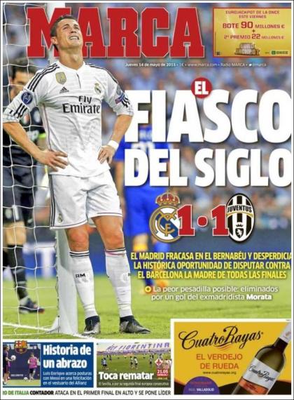 Мадридская Marca вышла в четверг с фотографией расстроенного лидера "Реала" Криштиану Роналду и заголовком "Фиаско века".
