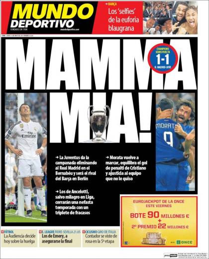 "Ювентус" позвонил в звоночек, огорчил "Реал" на "Бернабеу" и стал соперником "Барсы" по берлинскому финалу, – пишет на первой полосе каталонская El Mundo Deportivo. – Мората забил снова, ответив на пенальти Криштиану, и выбил из Лиги чемпионов команду, которая этого совершенно не хотела. Команда Анчелотти, если не произойдет чуда в Ла Лиге, завершит сезон тройным провалом.