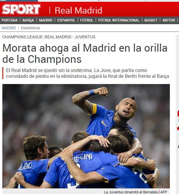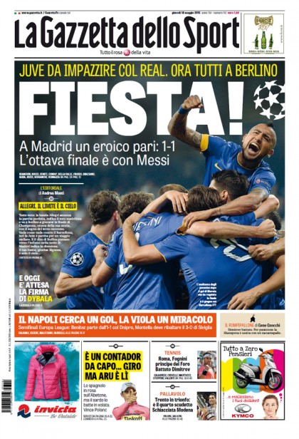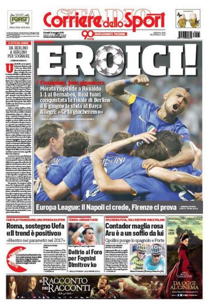 "Фантастическая ничья в Мадриде, и теперь финал. 6 июня – в Берлин, чтобы сделать историю", – пишет TuttoSport в своей передовице, изображающей празднующих гол игроков "Ювентуса", обнимающихся Буффона и Морату, а также кубок чемпионов. – Мората утихомирил "Реал", ответив на пенальти Роналду, а потом Маркизио и Погба упустили отличные возможности добыть победу на "Бернабеу". 12 лет спустя "бьянконери" снова попытаются выиграть Лигу чемпионов в восхитительной битве с "Барселоной".