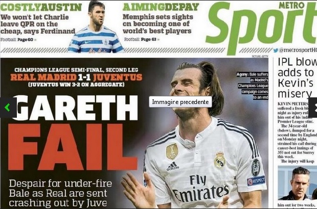 Английские СМИ, по понятной причине, повышенное внимание уделяют тому, что "Реал" и его валлийский полузащитник Гарет Бэйл провалились и не смогли добыть путевку в финал Лиги чемпионов.