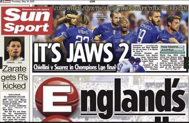 Таблоид The Sun предвкушает скорую встречу Джоржо Кьеллини и Луиса Суареса и дает финалу Лиги чемпионов свое название – "Челюсти-2".