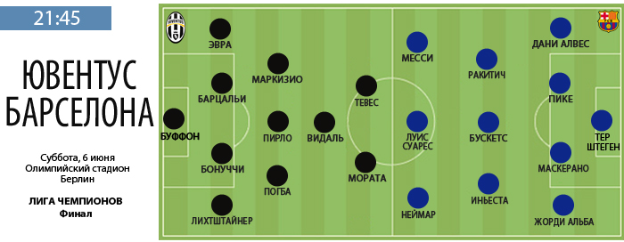 * Лидер обороны туринцев Джорджо Кьеллини не сможет сыграть в финале из-за повреждения камбаловидной мышцы левой ноги, которую он получил на тренировке три дня назад. * В тот же день к занятиям в основной группе приступил Андреа Барцальи. Он оправился от травмы бедра, полученной в игре 37-го тура против "Наполи". Именно Барцальи, скорее всего, закроет позицию левого центрального защитника. * Матч в Берлине может стать последним для Карлоса Тевеса в составе "Старой синьоры". Предметный интерес к нападающему проявляют "Атлетико" и "ПСЖ". Аргентинец заявил, что пока не определился со своим будущим. Его контракт истекает в июне 2016-го. * Полузащитник "Ювентуса" Поль Погба объявил о желании продолжить карьеру в "Барселоне". Агент француза Мино Райола требует от каталонцев трехкратного увеличения зарплаты для своего протеже, зарабатывающего в Италии 4 миллионов евро в год. Больше 12 в "Барсе" получает только Месси. Руководство "блауграны", дабы не накалять обстановку в команде, пока отвечает отказом. |