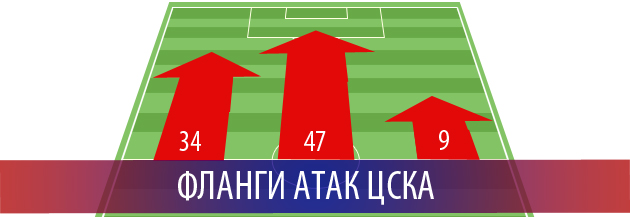Характерный признак нарушенной игры ЦСКА – резко бросающаяся в глаза асимметрия атакующих действий. За игру армейцы 34 раза приближались к чужим воротам через левый край, 47 – через центр, и лишь 9 раз проводником служила правая бровка. Взгляните на диаграмму и поразитесь размаху проседания одного фланга еще больше.