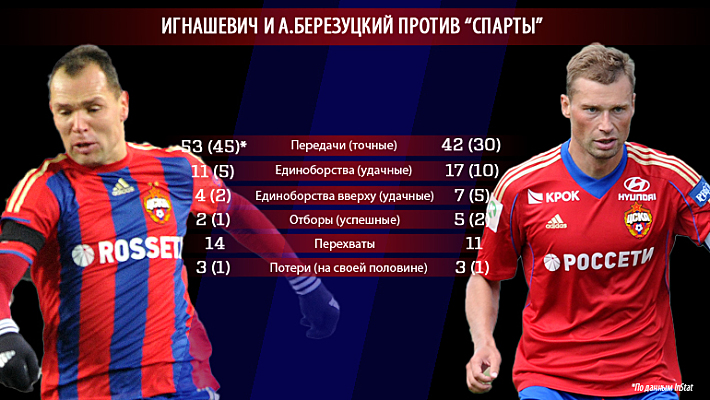 ...Попросил после игры генеральный директор красно-синих Роман Бабаев. Впрочем, чего уж тут скрывать – Игнашевич и Алексей Березуцкий провели очень слабую игру. Ошибались индивидуально, а зачастую и неудачно взаимодействовали. Понятно, что ни тот ни другой не может похвастаться высокой скоростью, и при разрывах между зонами ЦСКА, когда идет быстрая передача за спину, армейским ветеранам приходится очень трудно. И тут вопросы должны быть не только к ним. Другое дело, что Игнашевич и Березуцкий уступали в единоборствах на постоянной основе. Пять выигранных дуэлей из 11 – у первого, 10 из 17 – у второго. Такие показатели допустимы для нападающих, но только не для центральных защитников.