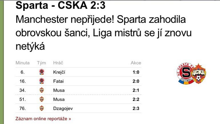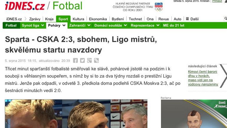 "Футболисты "Спарты" в ответном матче третьего квалификационного раунда не смогли победить после ничьей в Москве. При том, что после четверти часа игры вели в счете в два мяча и на кончиках пальцев уже имели 146 миллионов крон за попадание в следующий раунд... "Спарта" повержена. И десятилетие без Лиги чемпионов продолжается. Как и в прошлом году, теперь команда сыграет лишь в раунде плей-офф Лиги Европы.