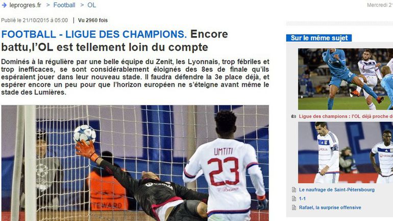 Отчет о матче в Петербурге поставлен на сайте L'Equipe под заголовком "Лион" медленно угасает". "С межсезонья все идет для "Лиона" наперекосяк. Чтобы пройти в 1/8 финала, потребуется чудо, – говорится в статье, автор которой расценивает как логичное поражение команды, которой не хватало уверенности в себе.
