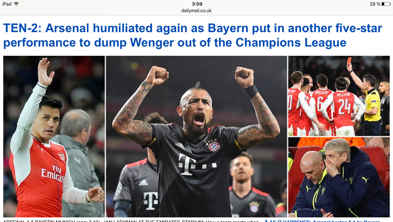 Джон Кросс, обозреватель The Mirror: "Абсолютное унижение "Арсенала". Не знаю, как Арсен Венгер сможет выжить после этого".