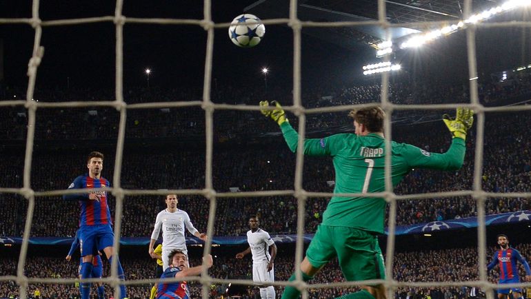 Происходит нечто невероятное. В этот момент все игроки "Барсы", включая вратаря тер Штегена, в районе чужой штрафной. Неймар беспрепятственно навешивает черпаком. Тер Штегена стерегут трое, но полузащитник Серхи Роберто выскакивает из-за спин защитников и в касание с линии вратарской (!) бьет точно.