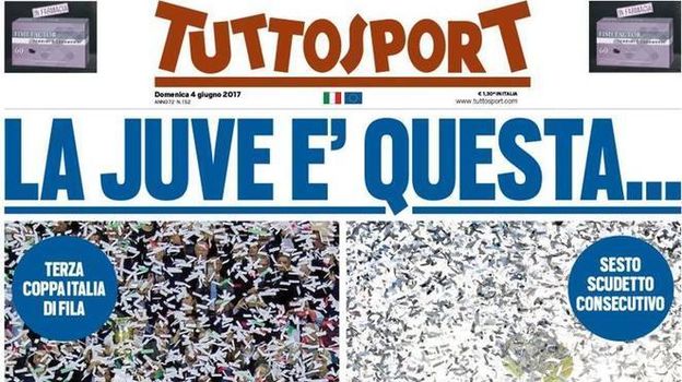 Туринское издание опубликовало на первой полосе два больших снимка. На одном "Юве" в шестой раз кряду празднует чемпионство, на втором – третью за три года победу в Кубке Италии.