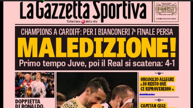 – Это была ужасная ночь, – пишет La Gazzetta. – Ужасная, потому что после достойного и бесстрашного первого тайма от команды Аллегри не осталось ничего. Ужасная, потому что от Буффона до Дибалы никто не заслужил за свою игру позитивной оценки. Ужасная, потому что "Юве" пропустил сразу четыре мяча, хотя до этого за весь турнир пропустил всего три. Ужасная, потому что все болельщики успели поверить, что чудо возможно. Ужасная, потому что проклятие становится все более устрашающим: "Юве" проиграл седьмой финал турнира из девяти...