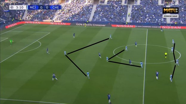 Однако до середины первого тайма мы видели, как «Сити» прессинговал соперников по схеме 4-3-3. Трио Рахим Стерлинг — Кевин Де Брейне — Рияд Махрез оказывало давление на центральных защитников «Челси», в полузащите тоже получалась ситуация 3-в-3, когда Мэйсон Маунт спускался глубже в полузащиту.