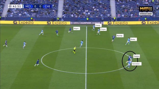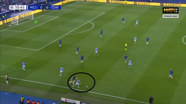 Как и ожидалось, «Челси» проходил интенсивное давление «горожан» за счет забросов вперед на Тимо Вернера. Раз за разом мы наблюдали рывки немца за спины защитникам во фланг, на который он уводил за собой либо Джона Стоунса, либо Рубена Диаша и оставлял Зинченко вне эпизода.