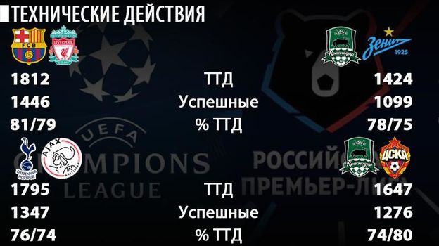 Но вопрос – насколько мы далеко, все равно актуален. А что если взять лучший матч в этом чемпионате России ("Краснодар" – "Зенит") и потрясающий, но, в общем-то, не выдающийся с точки зрения истории игру Лиги чемпионов – и сравнить их без эмоций? Попробуем разобраться на основе цифр из InStat.