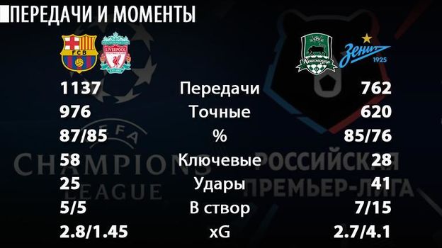 И еще раз: мы не сравниваем уровень участников этих матчей, оценивать "Барселону" на фоне "Краснодара" бессмысленно и смешно. Мы берем цифры этих матчей, вынося за скобки то, что одни игры прошли в главном клубом турнире Европы, а другие – в национальном чемпионате средней руки. И на основе разницы пусть каждый сам делает для себя выводы.