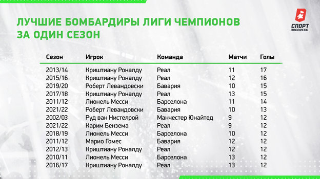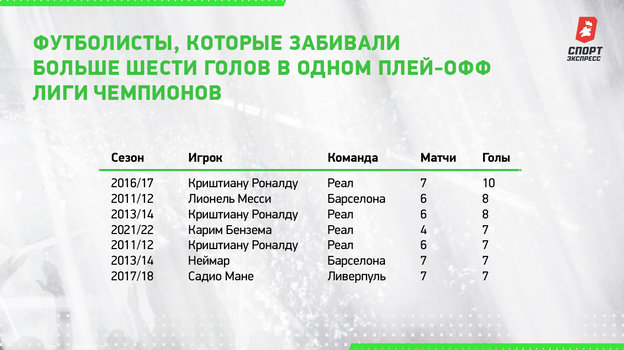 И если на снайперский рекорд сезона от Криштиану Роналду Бензема вряд ли замахнется (шесть голов в трех решающих матчах — цифры, близкие к фантастике), то о лучшем результате в плей-офф француз может задуматься. В четырех встречах он уже отличился семь раз. По восемь голов весной забивали Месси и Роналду, девять — никто, десять — только Криштиану.