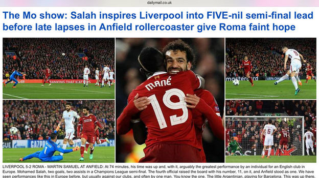 "Мо Салах, Мо Салах, он носится по флангу", – пел во все горло "Энфилд". Но если бы это чудо природы просто "носилось по флангу", как поется, то у "Ромы" был бы какой-то шанс остановить его. Но нет, Салах – это монстр, который носится по всему полю. И он поставил подпись под четырьмя из пяти голов "Ливерпуля" в этот вечер: два раза забил сам, не празднуя гол, а после перерыва добавил к урожаю две голевые передачи. Финал Лиги чемпионов после матча в Ливерпуле стал дальше для "Ромы", но слово "невозможно" сейчас неуместно – после победы над "Барселоной" его нельзя использовать. В принципе, просто нужно повторить счет 3:0: то, что мы уже видели.